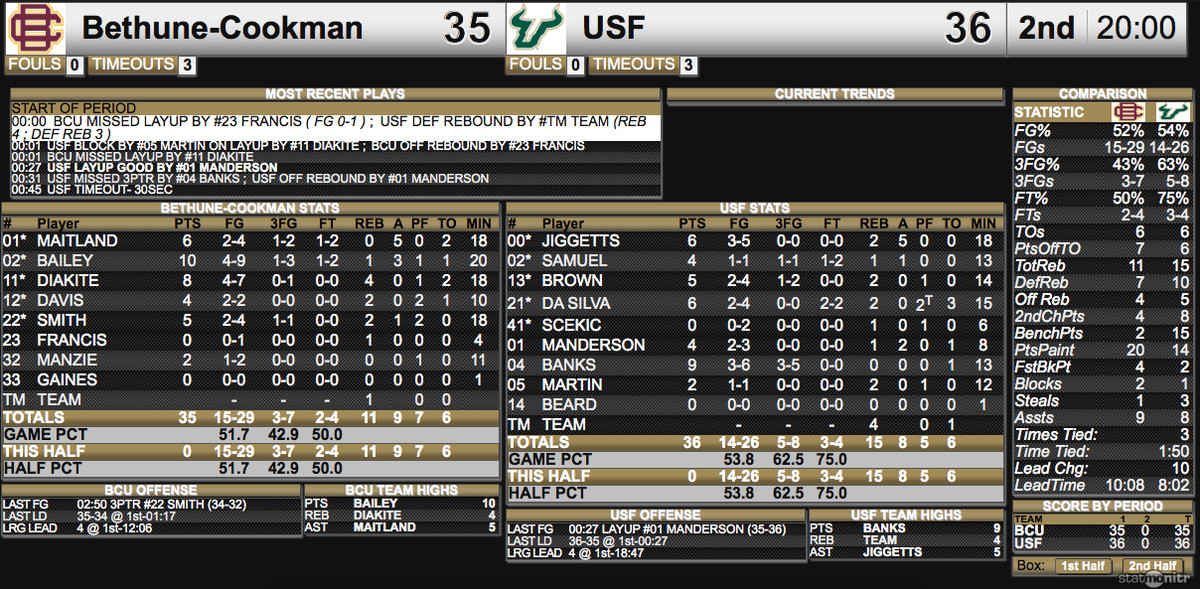 Bethune-Cookman went on a 6-0 run over three minutes, and Da Silva was called for a technical foul, but it’s whatever. We’re looking past it. Forward Isaiah Manderson laid it in for a 36-35 lead, and the Bulls ended the half by showing off some defensive skills on the other end.